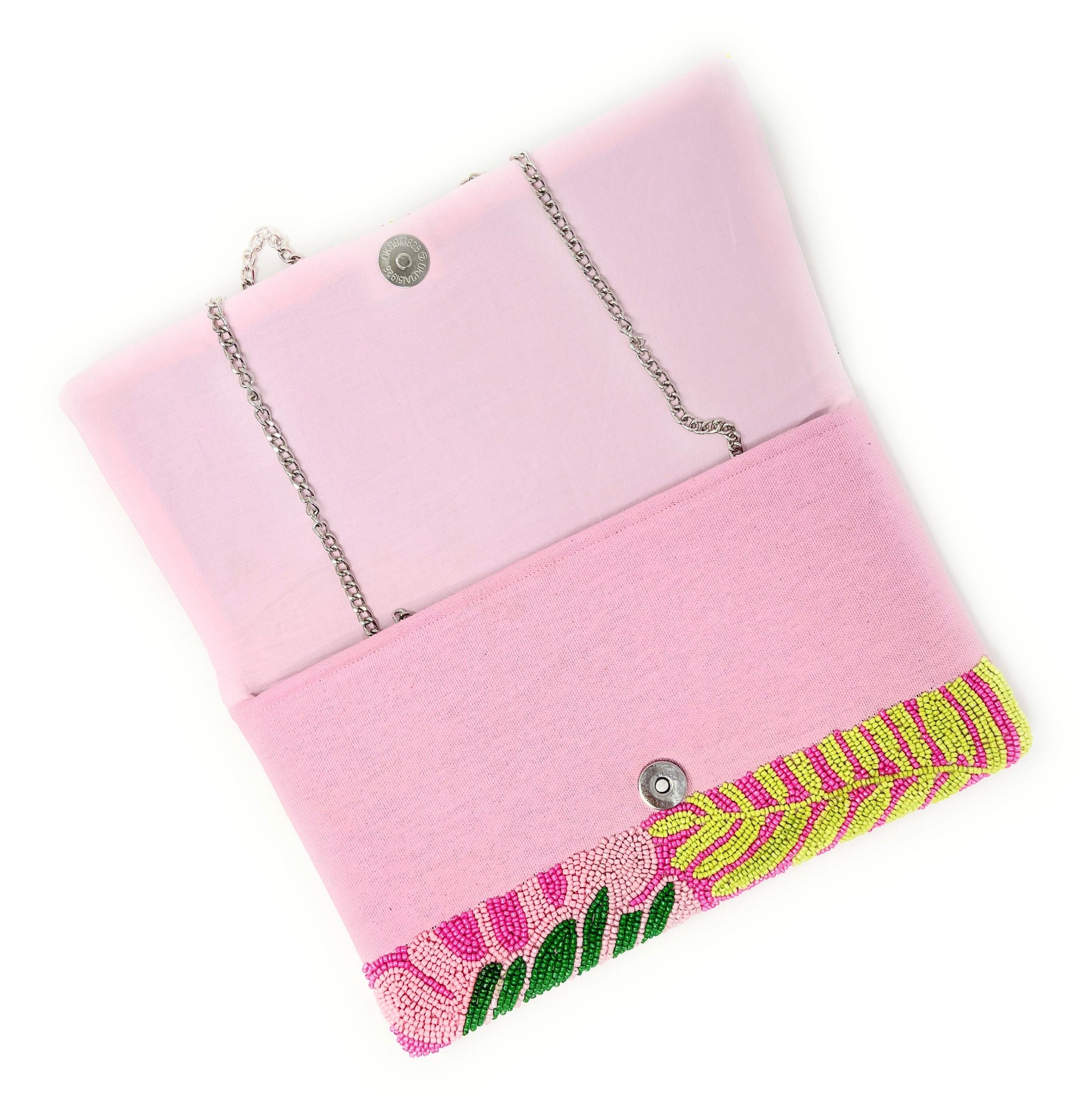 Inspired by the flora of Southeast Asia’s tropical rainforests, this beaded piece embodies the forms of tropical plants like strelitzia, palm leaves, and ferns through the art of beading. The contrasting color combination of saturated pink and vibrant green aligns with the vibrant trend of “dopamine dressing” while infusing a nostalgic texture through vintage beading techniques. It embodies a crossover between tropical resort style and retro art, creating a portable “miniature tropical garden” for urban women.